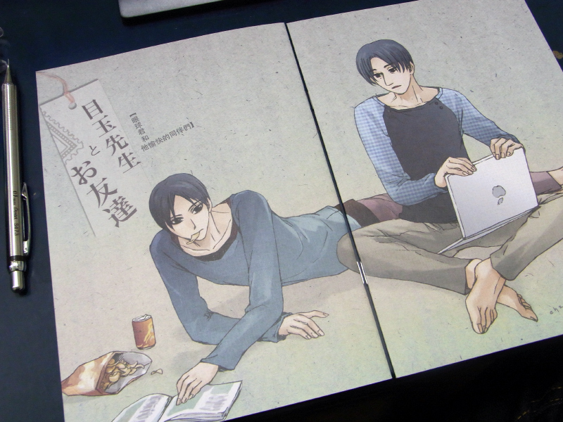 )長這麼大還沒有親眼看過櫻花, 所以當我知道公司對面的公園以及中正紀念堂有種櫻花時,馬上就跑去看了。 公園的櫻花很小,看到時心裡想著「原來櫻花實際上這麼小朵啊...」 但是在中正紀念堂看到超大朵的大漁櫻時, 反而一時適應不過來。 可惜太晚知道這些地方有櫻花樹了,看不到整片盛開的情景。 好想看櫻花紛飛的景象啊.... 完整封面圖請點右邊連結→( Zoom in )【新刊概要】 目玉先生とお友達中心で、イラストと漫画を描き。 ★預定2012年1月28日CWT30首販。 名稱雖然叫試閱小冊,不過性質比較接近本篇的別冊, 重點是讓各位先大概瞭解一下這兩個人的關係, 只有8P的內容,卻讓我畫到快要去天國了...^q^